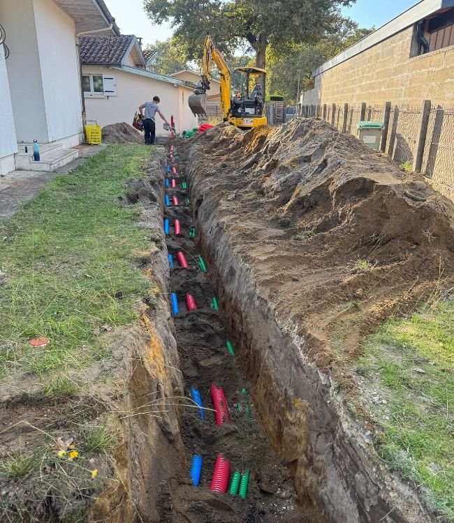 Nous optimisons le tracé des tranchées pour minimiser l’impact sur votre terrain et faciliter les interventions futures, tout en respectant les distances de sécurité entre chaque réseau.
